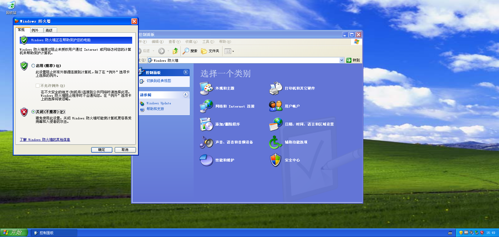 - 虚拟机 200301:打开「控制面板」→「Windows 防火墙」,选择 “关闭”,点击「确定」(Windows Server 2003 的防火墙默认可能拦截 ICMP 协议,导致 ping 不通)。