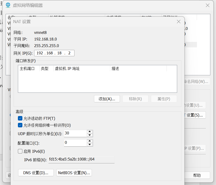 192.168.18.2(文档指定值),若不一致,手动修改为 192.168.18.2,点击「确定」; - 点击「应用」→「确定」,保存 VMnet8 的 NAT 配置(此步骤核心是确保网关与文档一致,否则虚拟机无法通过网关访问外网)。