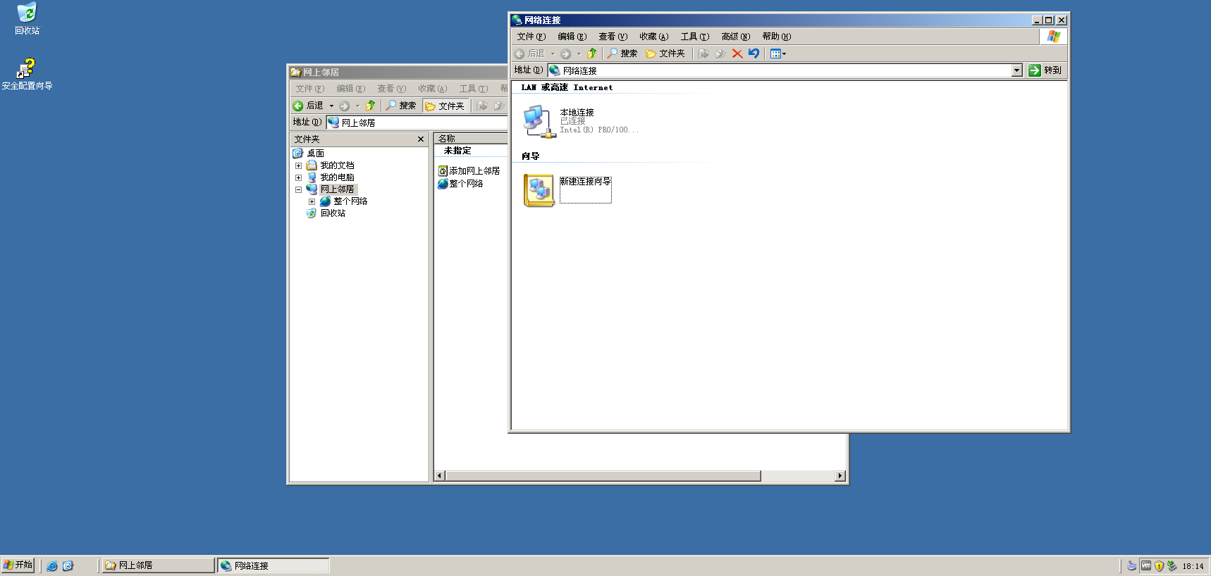 启动虚拟机 200301,进入 Windows Server 2003 系统,右键桌面「网上邻居」→「属性」,找到 “本地连接”(虚拟机的网卡)。